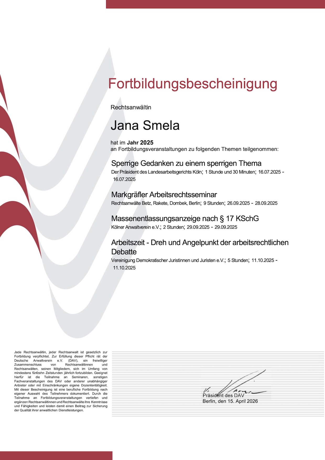 Frau Smela nimmt jedes Jahr im Umfang von mindestens 15 Stunden an arbeitsrechtlichen Fortbildungen teil. Hierfür erhält sie jährlich die Fortbildungsbescheinigung des Deutschen Anwaltvereins.